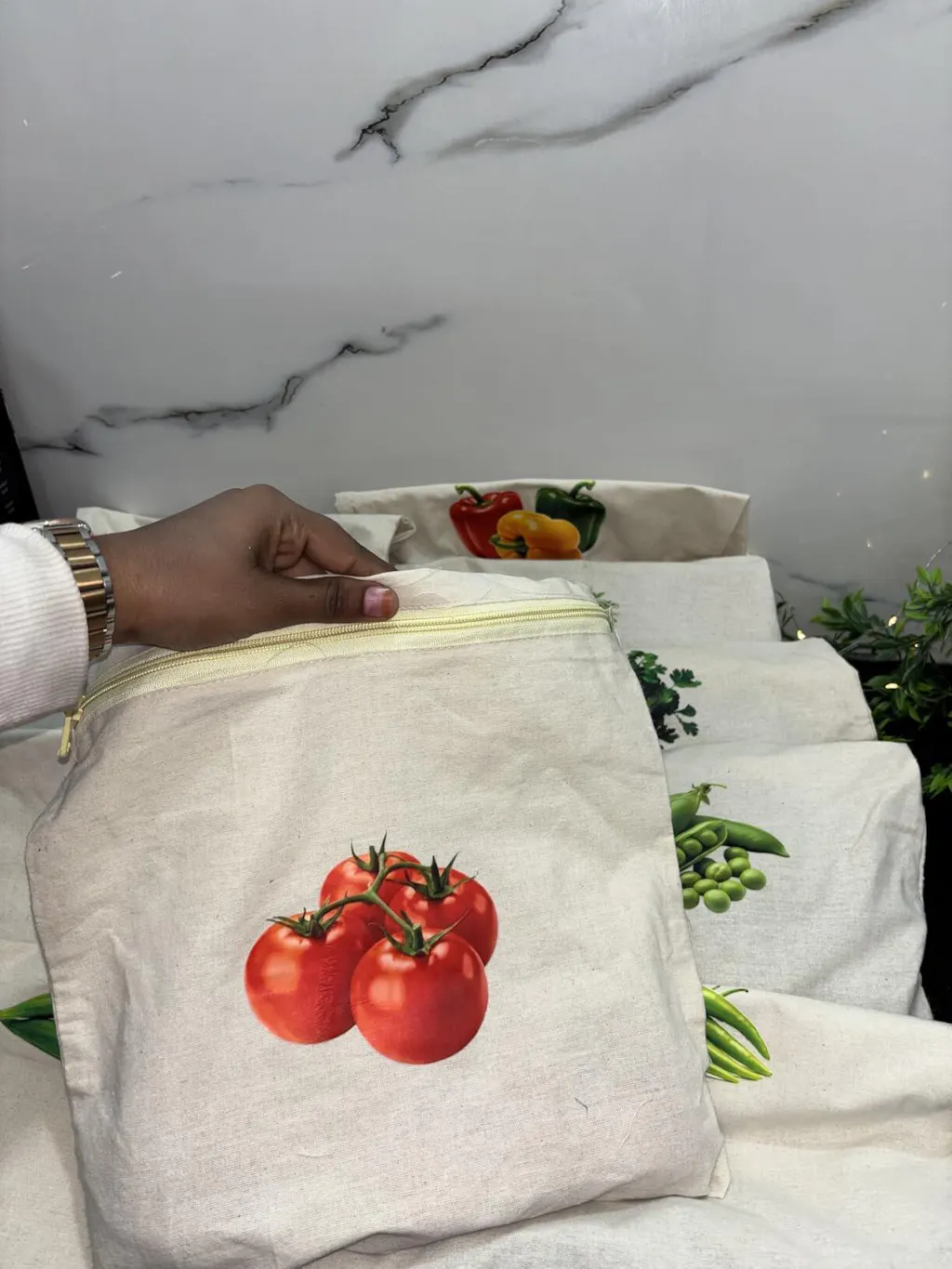 2️⃣ Place vegetables inside the cotton bag.